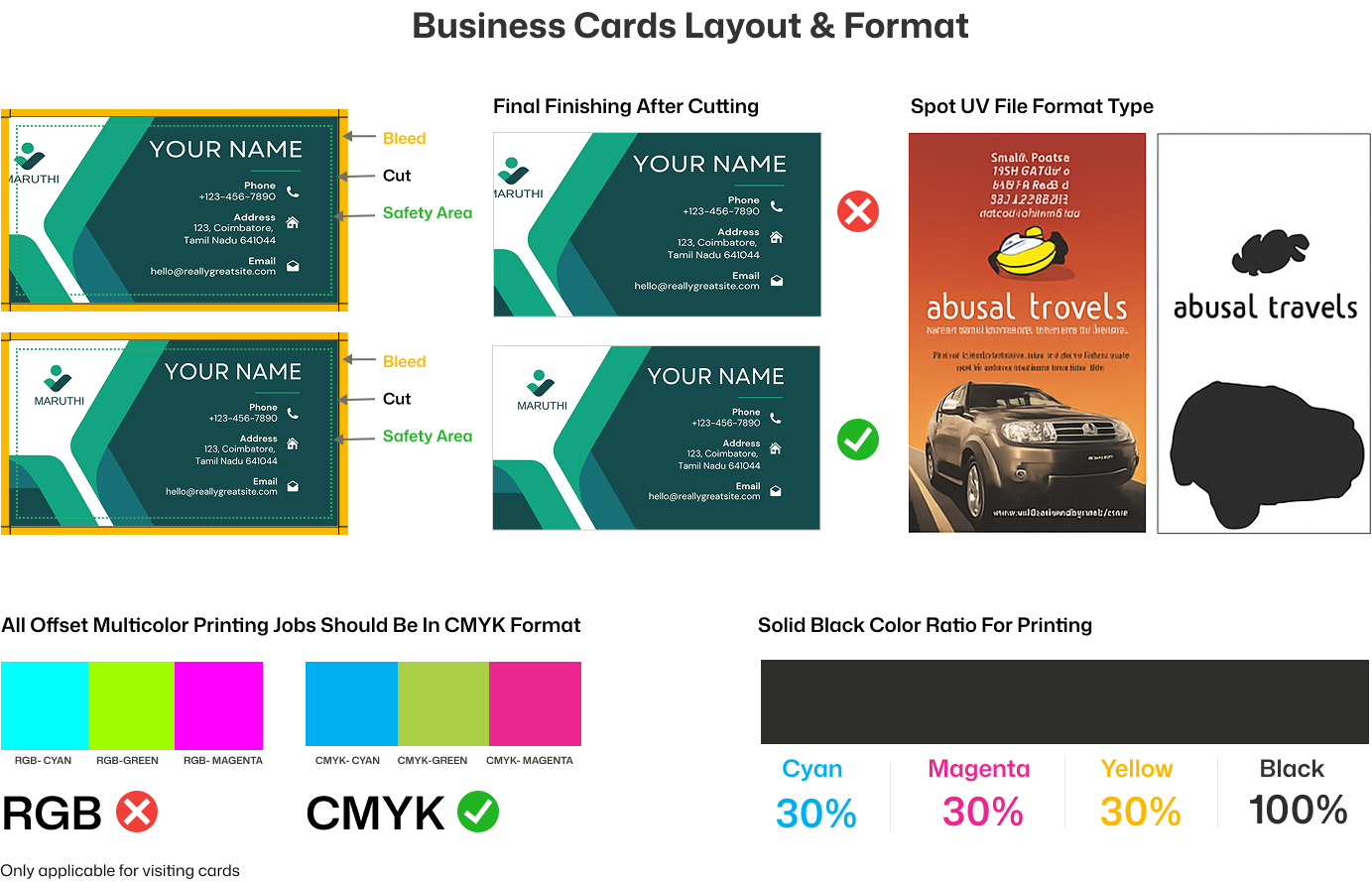 Stretch your design up to the Bleed area to avoid white borders appearing around your card. Keep all your information within the safety area.
